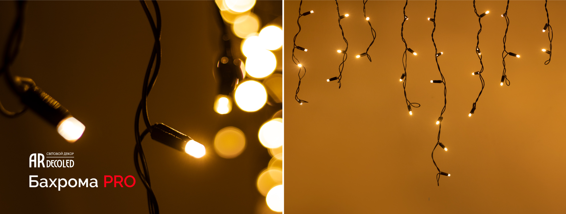 Гирлянды «Бахрома» серии PRO подойдут для крупных коммерческих проектов благодаря надежному и прочному каучуковому проводу. Модель «Бахрома» особенно эффектно смотрится при оформлении потолков, пролетов между фонарями и деревьями, а также навесов над открытыми террасами.