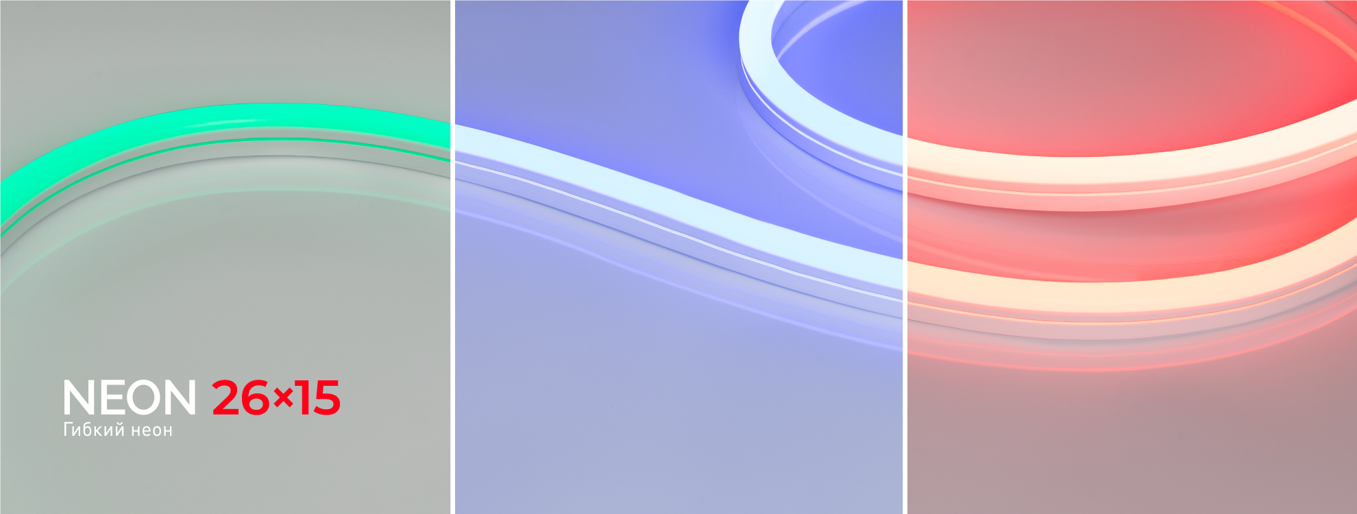 Гибкий неон NEON — отличное решение для RGB-подсветки ступеней, рекламных конструкций, а также для оформления кафе, баров, ванных и детских комнат. За счет прямоугольного сечения 26×17 мм гибкий неон легко встраивается в профиль и небольшие углубления в мебели. В серии представлены модели с напряжением питания 24 и 230 В.