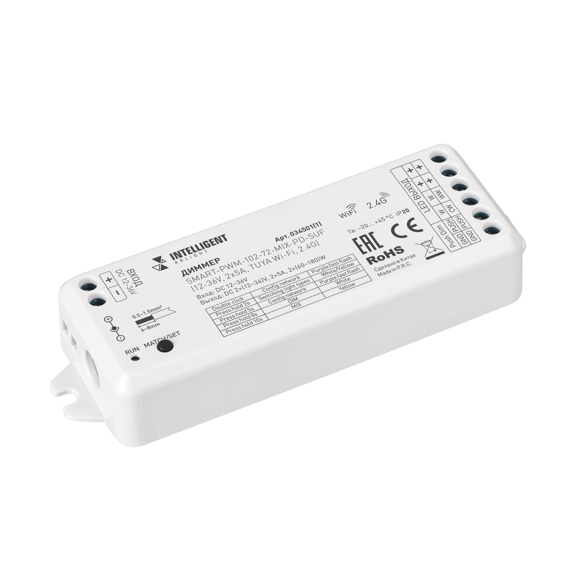 INTELLIGENT ARLIGHT Диммер SMART-PWM-102-72-MIX-PD-SUF (12-36V, 2x5A, TUYA Wi-Fi, 2.4G) (IARL, IP20 Пластик, 5 лет)