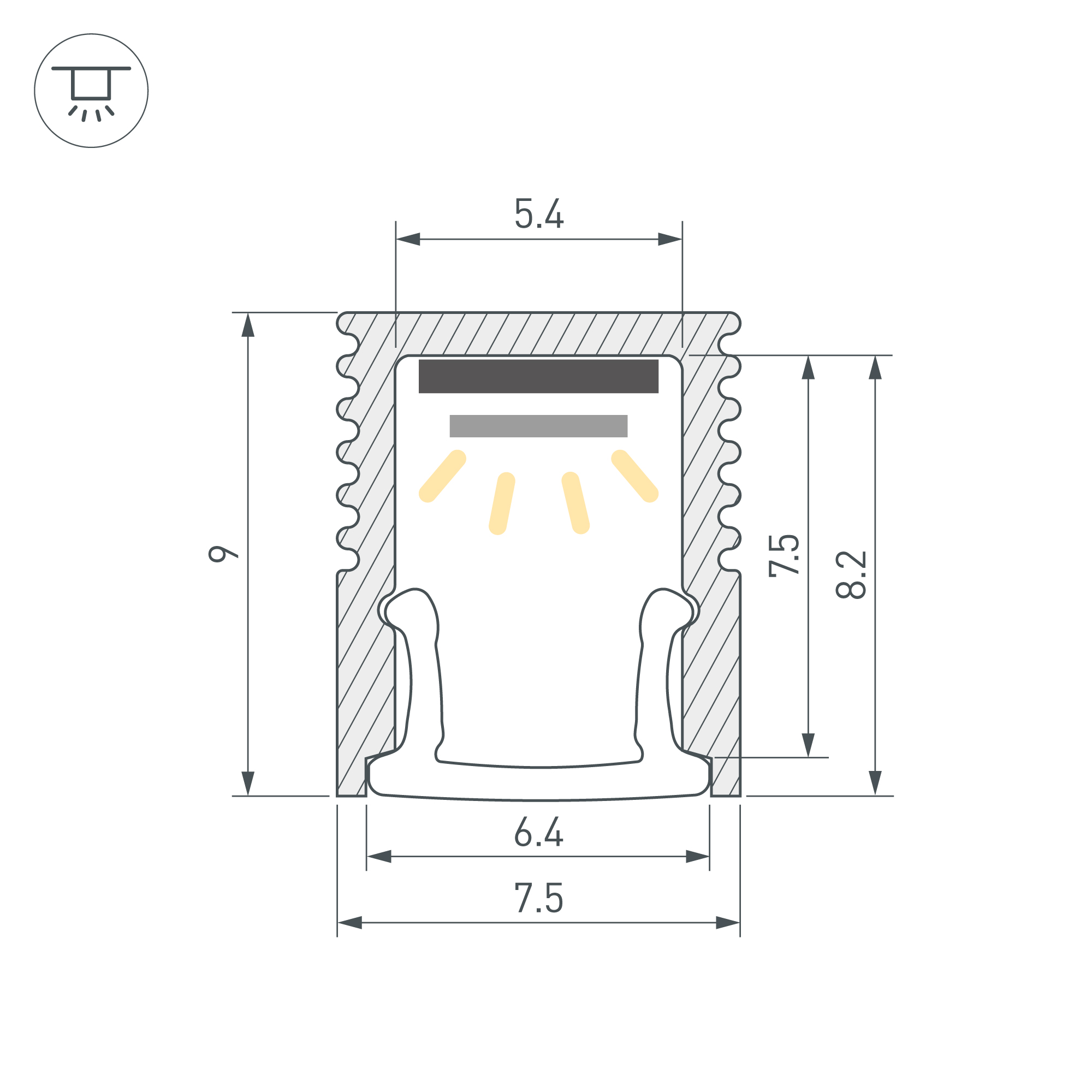 Накладной микро-профиль из анодированного алюминия в комплекте с матовым экраном со светопропусканием 61%, заглушками и держателями для подсветки мебели, пазов, ниш и других элементов интерьера. Габаритные размеры профиля составляют 2000 мм в длину, 7,5 мм в ширину и 9 мм в высоту. Площадка для установки светодиодных лент позволяет использовать ленту шириной до 5,4 мм и мощностью до 8,9 Вт/м. Это обеспечивает гибкость в выборе светодиодных лент и создает потрясающие световые решения.
