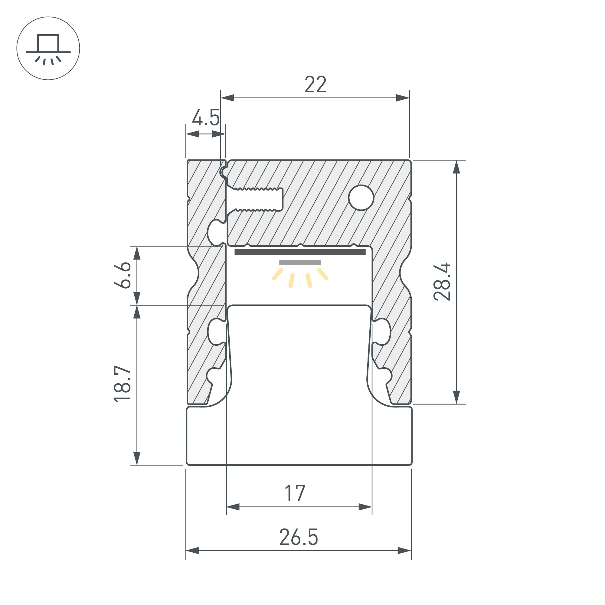 Алюминиевый светотехнический профиль для установки светодиодной ленты или линейки. Цвет серебристый. Длина 2000 мм, размер сечения 26,5х28,4 мм. Устойчив к стандартным нагрузкам для полов, встраиваемый монтаж с помощью держателей или профиля-держателя (приобретаются отдельно). Рассеиваемая тепловая мощность 29,6 Вт/м позволяет подобрать источник света необходимой яркости и температуры свечения и реализовать самые интересные решения.