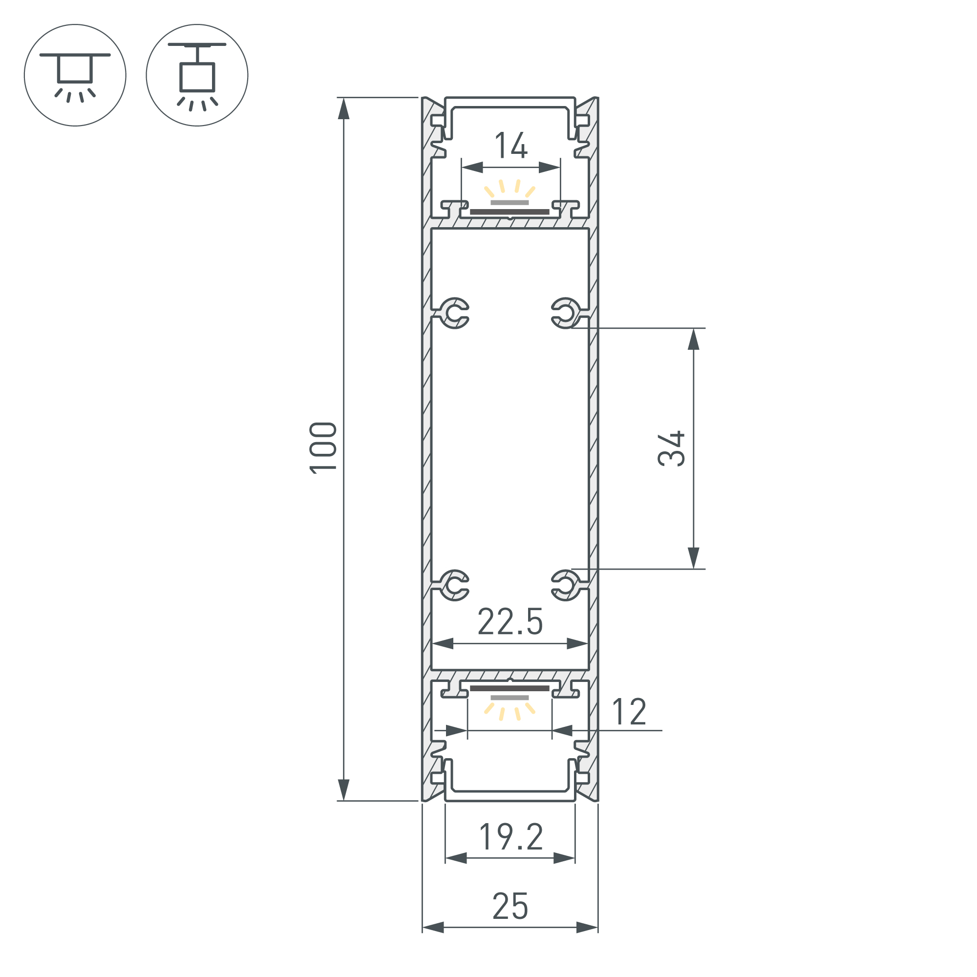 Под заказ от 20 м. Алюминиевый профиль для светодиодных лент и линеек, свечение вверх и вниз. Цвет - белый RAL9003 (порошковая окраска). Габаритные размеры (L×W×H): 2500x25x100 мм. Ширина площадки для ленты 12 мм. Экраны, заглушки и другие аксессуары приобретаются отдельно. Цена за 1 метр.