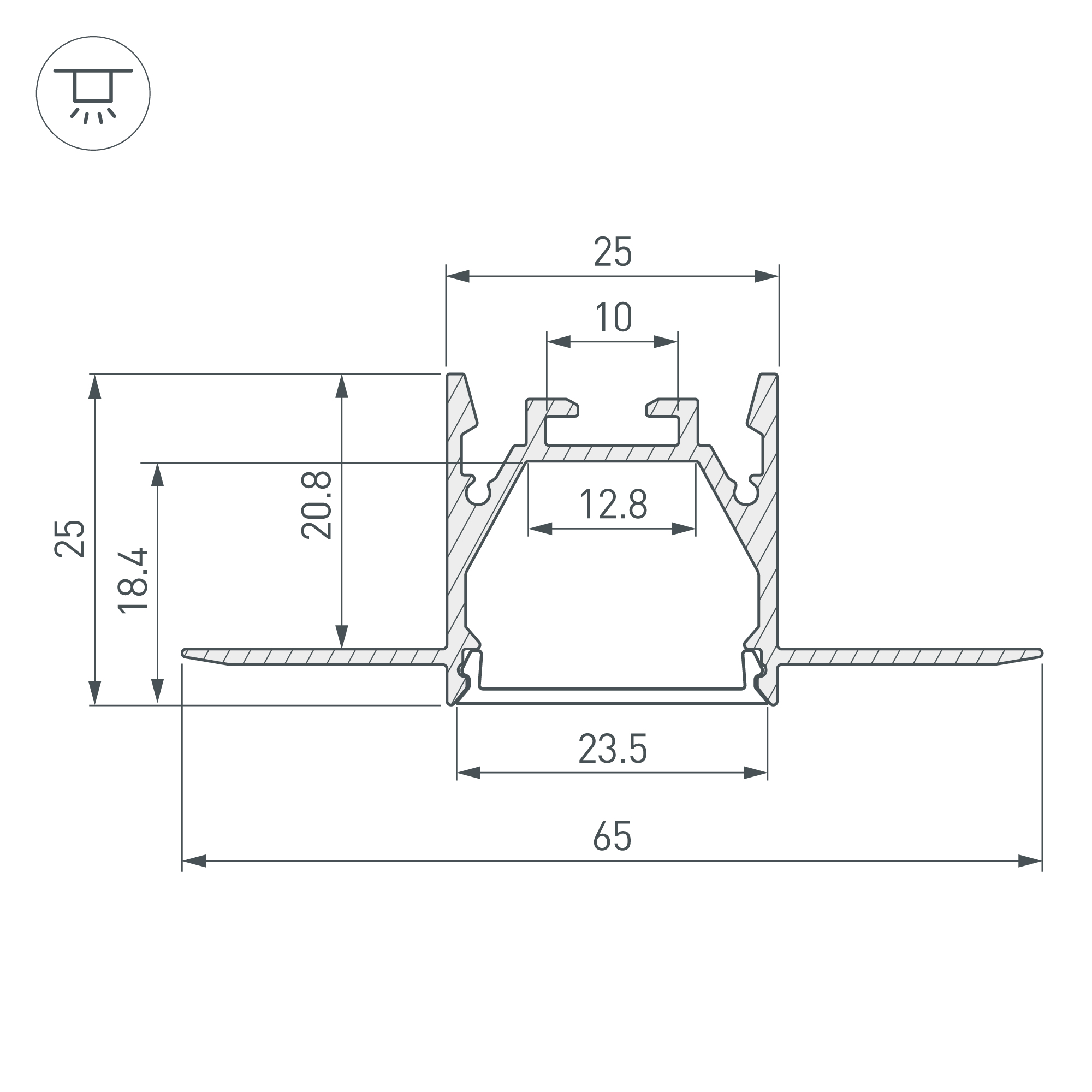 Встраиваемый профиль со скрытым фланцем под строительную отделку из анодированного алюминия серебристого цвета для основной и контурной подсветки помещений. Габаритные размеры профиля составляют 2000 мм в длину, 65 мм в ширину и 25 мм в высоту. Паз для установки 25 мм. Площадка для установки светодиодных лент позволяет использовать ленту шириной до 12,8 мм и мощностью до 36,9 Вт/м. Это обеспечивает гибкость в выборе светодиодных лент и создает потрясающие световые решения.