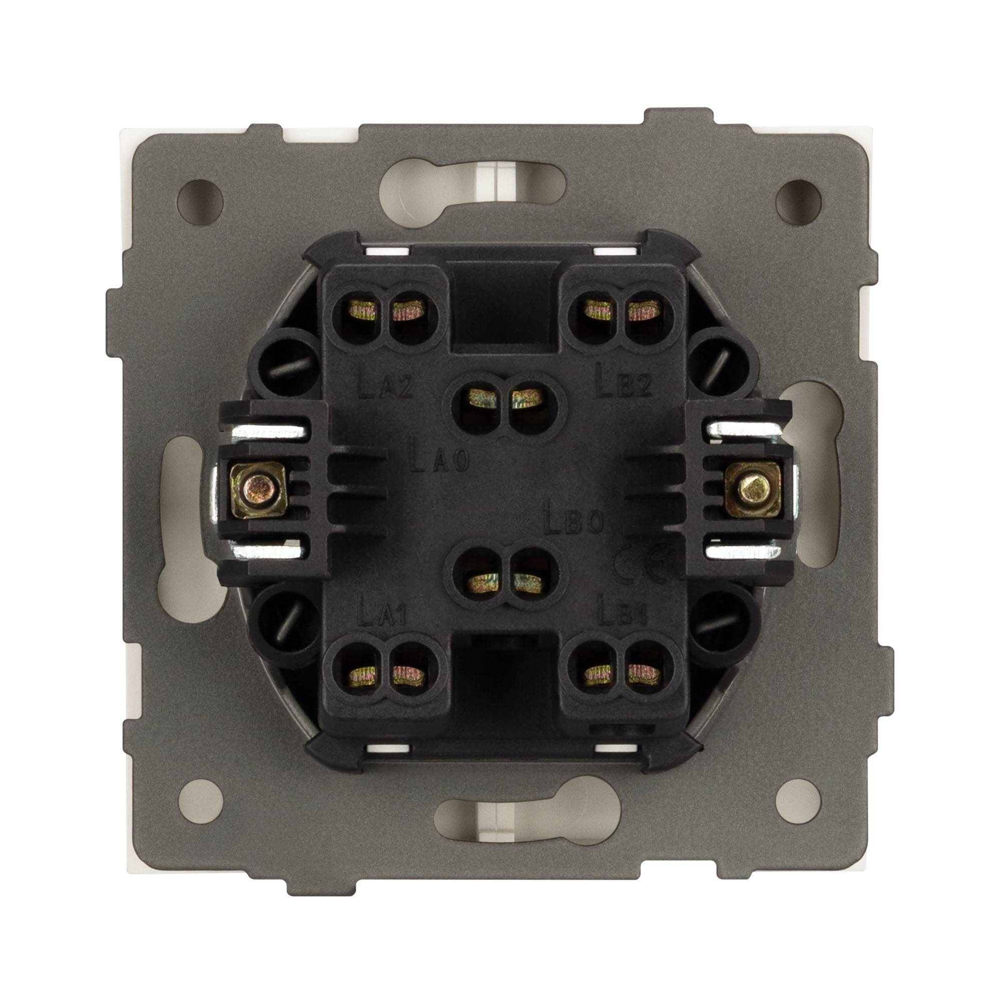 Механизм выключателя света клавишный на 1 пост 2 клавиши (проходной). Цвет - белый, с Soft-Touch покрытием. Без фронтальной рамки. Уровень пылевлагозащиты IP20. Выключатель устанавливается в стандартный подрозетник круглого сечения диаметром 60мм.
