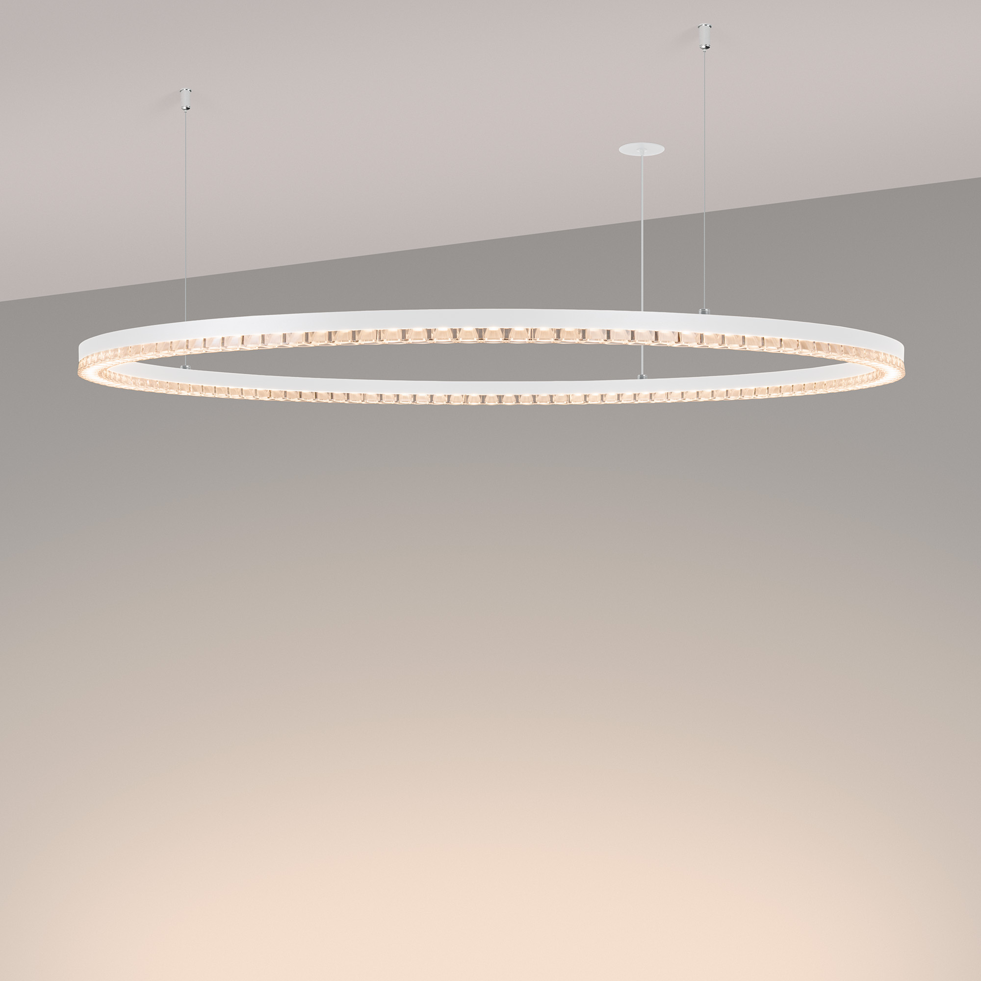 Под заказ. Подвесной светильник. Мощность 80 Вт, св. поток 6370 лм, 80-95 лм/Вт, теплый 3000 K, CRI>90, угол 45°, напряжение питания 230 В. Белый круглый корпус из алюминия, экран PMMA, степень защиты IP20. Размер: диаметр 1250 мм, высота 34 мм, ширина профиля 30 мм, размер чаши: диаметр 65 мм, высота 26 мм. Монтаж подвесной, длина подвеса 1200 мм, тип чаши встраиваемый, диаметр установочного отверстия чаши 60 мм. Драйвер (2 шт.) 9-38 В, 1050 мА. Пульсация <0,3 %.