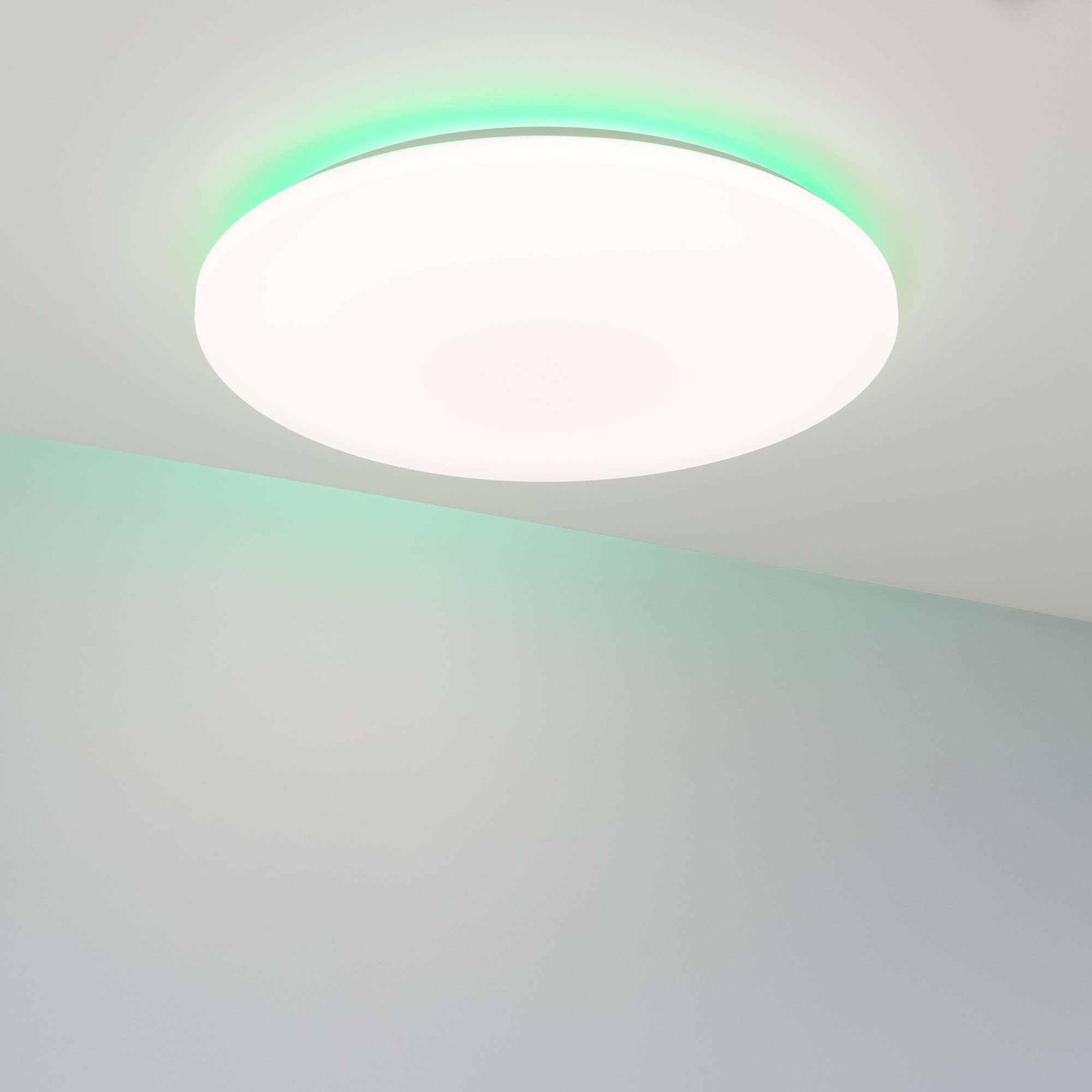 Светодиодный светильник с изменяемой цветовой температурой в диапазоне от 2700К до 6500К, с верхней подсветкой RGB. Мощность полная 50 Вт, св. поток 3000-3750 лм, 60-75 лм/Вт, CRI>90, угол 100°, напряжение питания 230 В. Белый круглый корпус из пластика, экран PC, степень защиты IP20. Размер: диаметр 570 мм, ширина 600 мм, высота 114 мм. Монтаж накладной. Драйвер TUYA Zigbee 23-40 В, 1300 мА, пульсация <5%. Мобильное приложение Smart Life или Intelligent Arlight для iOS и Android.
