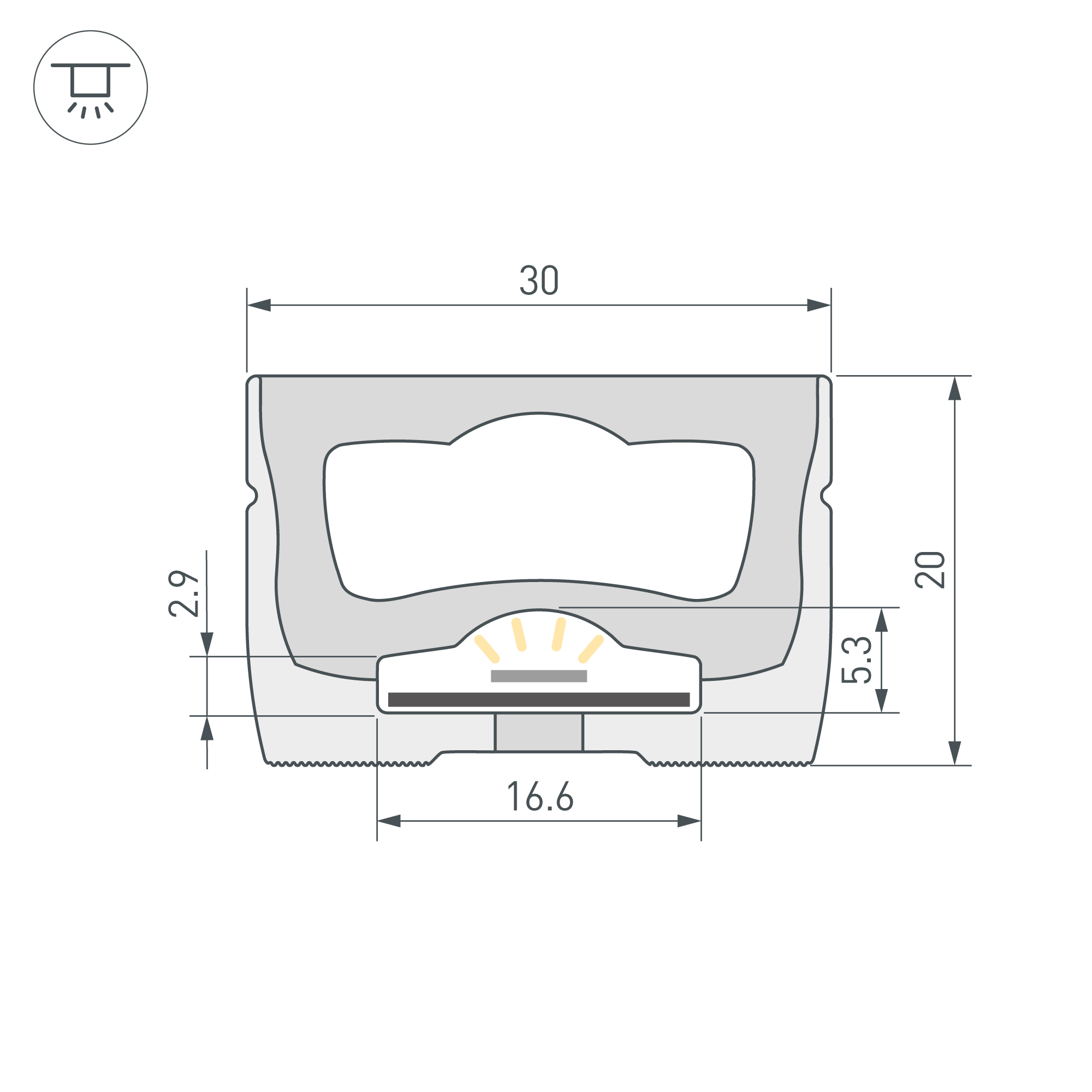 Цельнолитой силиконовый гибкий профиль белого цвета. Габаритные размеры профиля составляют 10000 мм в длину, 30 мм в ширину и 20 мм в высоту. Вертикальный изгиб TOP, минимальный радиус изгиба 60 мм. Угол излучения 118°. Для удобства установки ленты по всей длине профиля протянута нить. Площадка для установки светодиодных лент позволяет использовать ленту шириной от 12 до 15 мм, высотой до 4 мм и мощностью до 10 Вт/м. Это обеспечивает гибкость в выборе светодиодных лент и создает потрясающие световые решения. Для установки во влажных помещениях необходима герметизация при помощи двухкомпонентного эпоксидного герметика. Класс пылевлагозащиты – IP65 (при соблюдении технологии герметизации). Этот продукт представляет отличное решение для создания современных световых проектов и обеспечивает надежную и стильную основу для установки светодиодов. Для накладного монтажа на 1 метр профиля рекомендуем использовать не менее 3-х держателей. Подходит только для установки внутри помещения