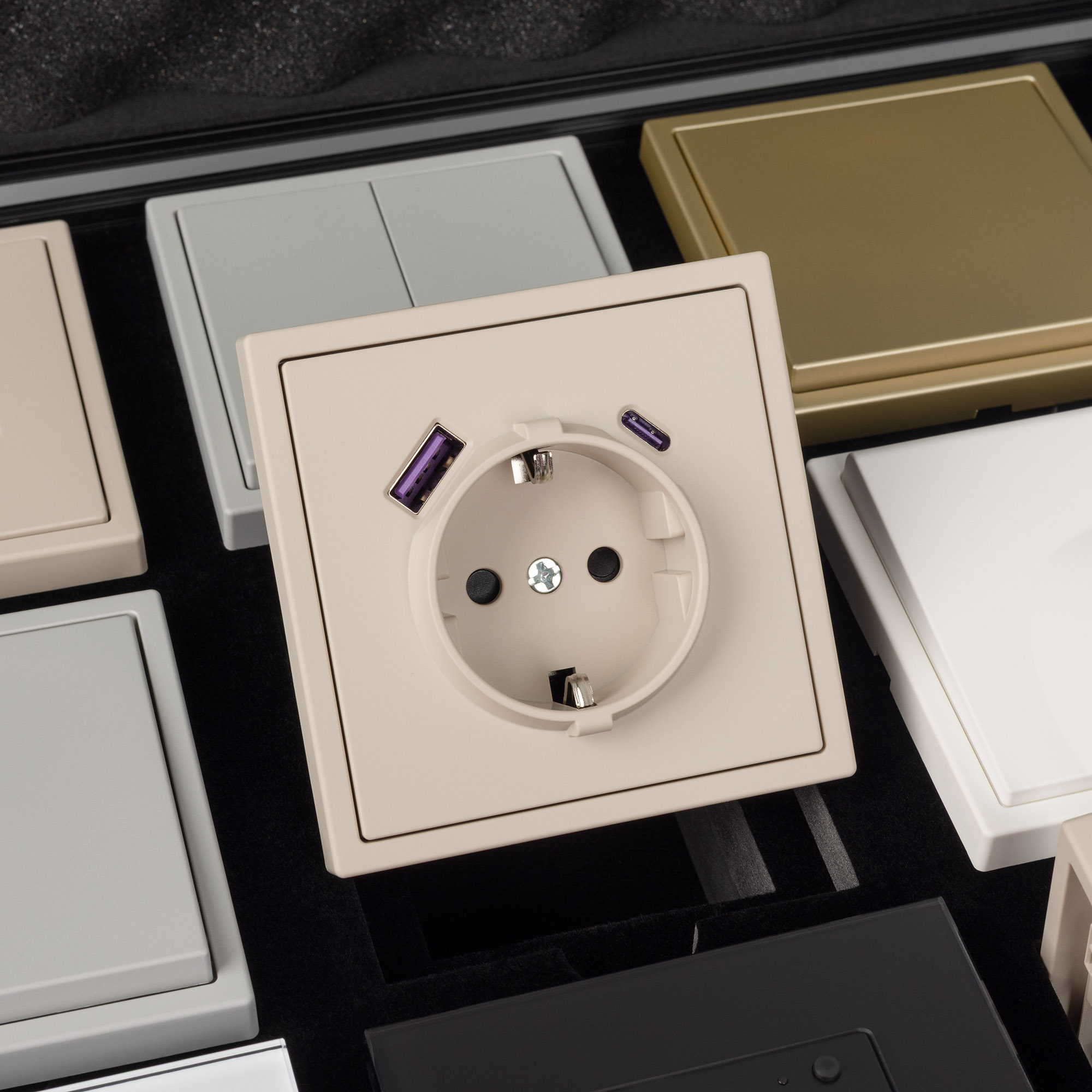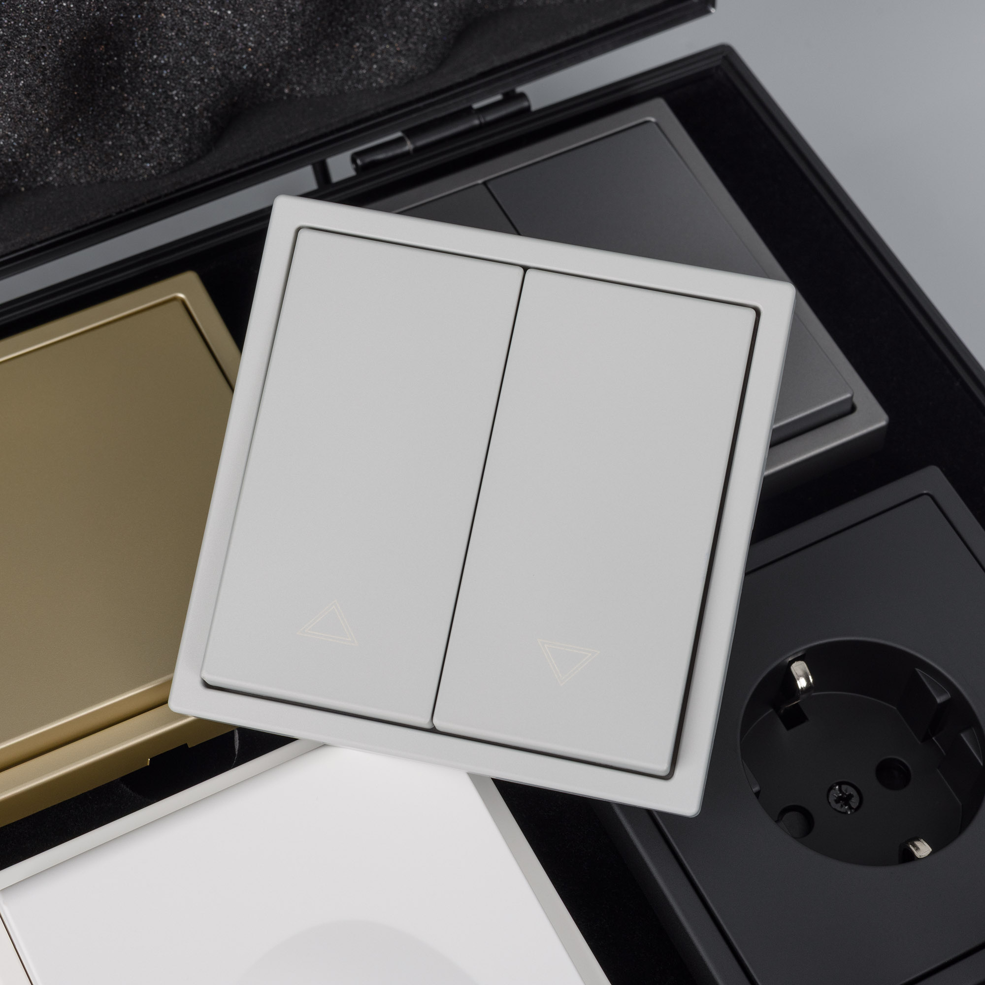 Демо-кейс с сериями NOBE и OMALI. Демо-кейс содержит: Рамки серии NOBE в цветах Белый кварц, Черный оникс, Золотой песок и Серый базальт. Поверхность рамок имеет Soft-Touch покрытие: арт.054212 - 2шт арт.054213 - 2шт арт.054214 - 2шт арт.054211 - 2шт арт.059454 - 4шт арт.059455 - 4шт Механизм розетки под евровилку в цвете Черный оникс – арт. 054277 Механизм розетки влагозащищенный в цвете Белый кварц – арт. 054280 Механизм сдвоенной розетки под выходы RJ45 для интернет кабеля в цвете Кашемир - арт.059450 Механизм розетки под евровилку с доп. Выходами USB Type A+C в цвете Кашемир – арт. 059444 Механизм выключателя на две клавиши с подсветкой LED (непроходной) в цвете Серый базальт - арт.054266. Механизм выключателя на одну клавишу (непроходной) в цвете Золотой песок - арт.054244 Механизм выключателя на одну клавишу звонкового типа в цвете Никель - арт.059437 Механизм выключателя для управления шторами и жалюзи в цвете Никель – арт. 059435 Выключатель сенсорный на одну клавишу с Zigbee управлением в белом цвете - арт.050035 Розетка с Zigbee управлением в черном цвете - арт. 050216 Рамки представленной серии накладного типа монтажа - не требуют дополнительного оборудования для установки рамки на механизме.