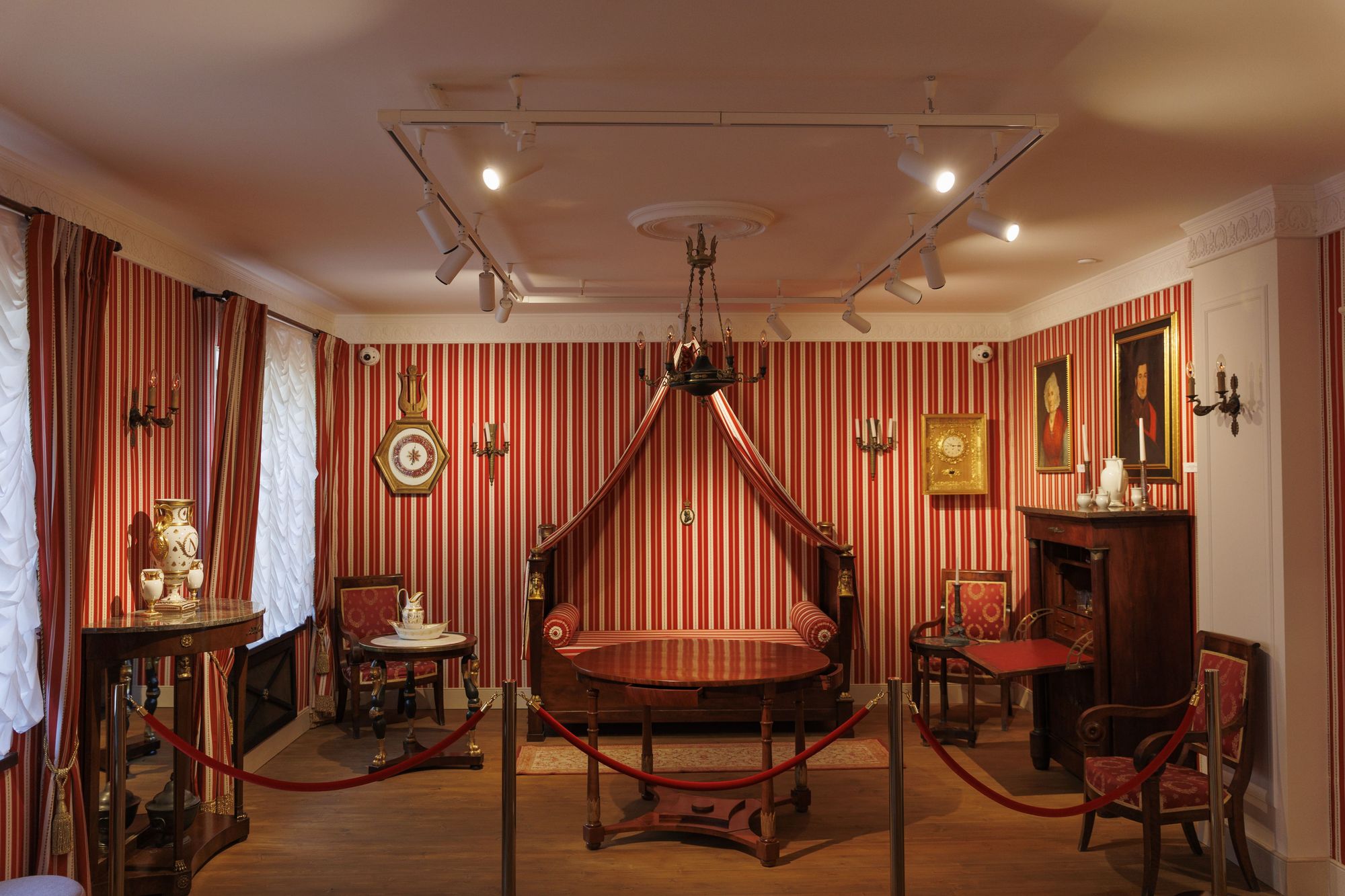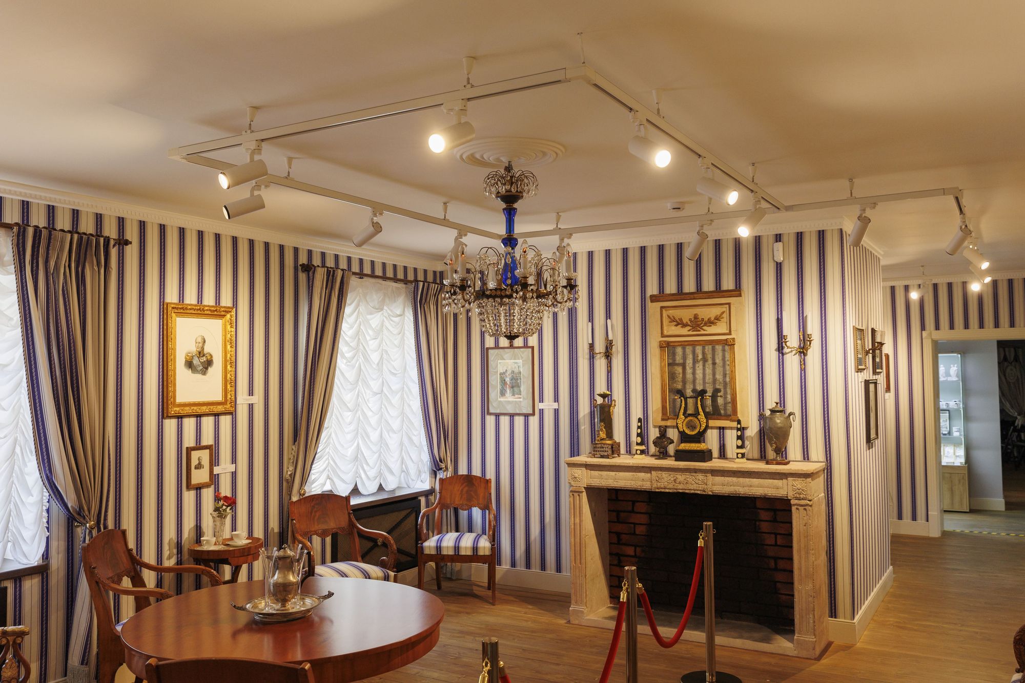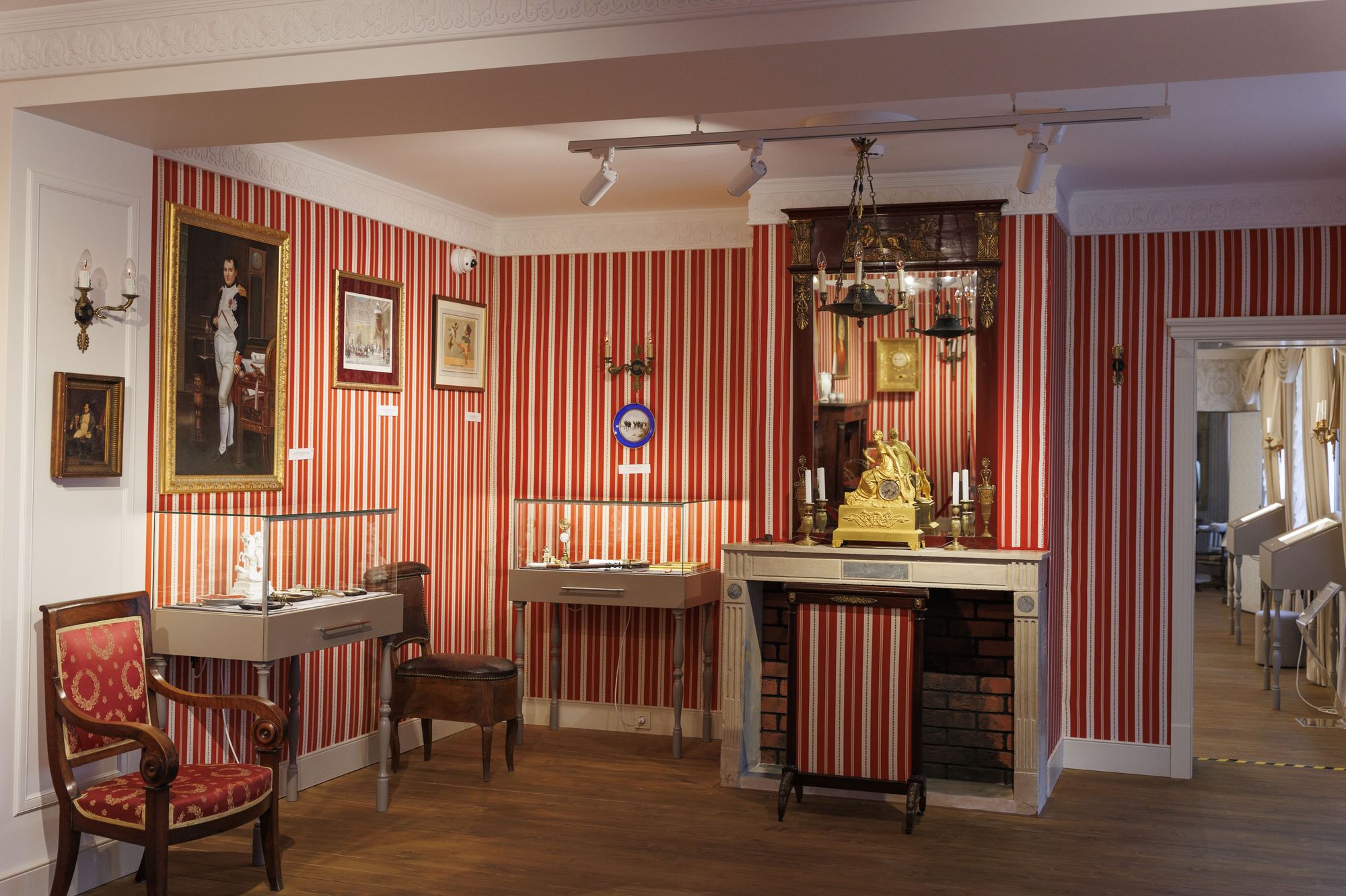 Чтобы ничто не мешало посетителям ощутить себя во дворце наполеоновской эпохи, для освещения были использованы трехфазные трековые светильники GELIOS. Аккуратные цилиндрические светильники и изящные треки не перегружают пространство, а белый цвет оборудования помогает ему слиться с поверхностью потолка. Треки установлены на подвесы, благодаря чему потолок выглядит воздушно на контрасте с массивной экспозицией.