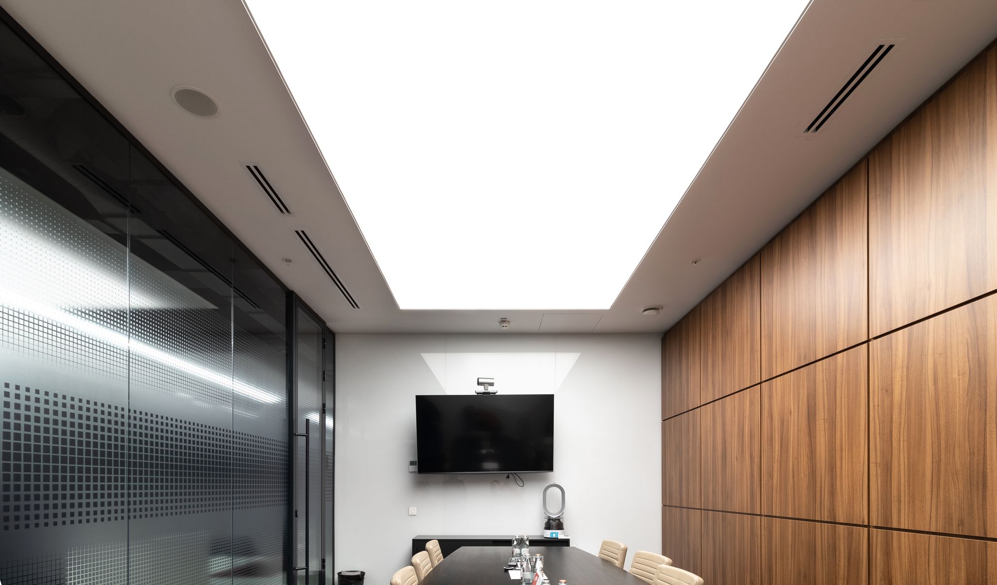 В качестве центрального элемента и основного освещения выступает большое прямоугольное полотно натяжного потолка, подсвеченное светодиодной лентой. Декоративным элементом является яркая световая полоса, которая отражается в зеркальных стенах и глянцевом потолке. За счет использования ярких световых акцентов помещение кажется более объемным.