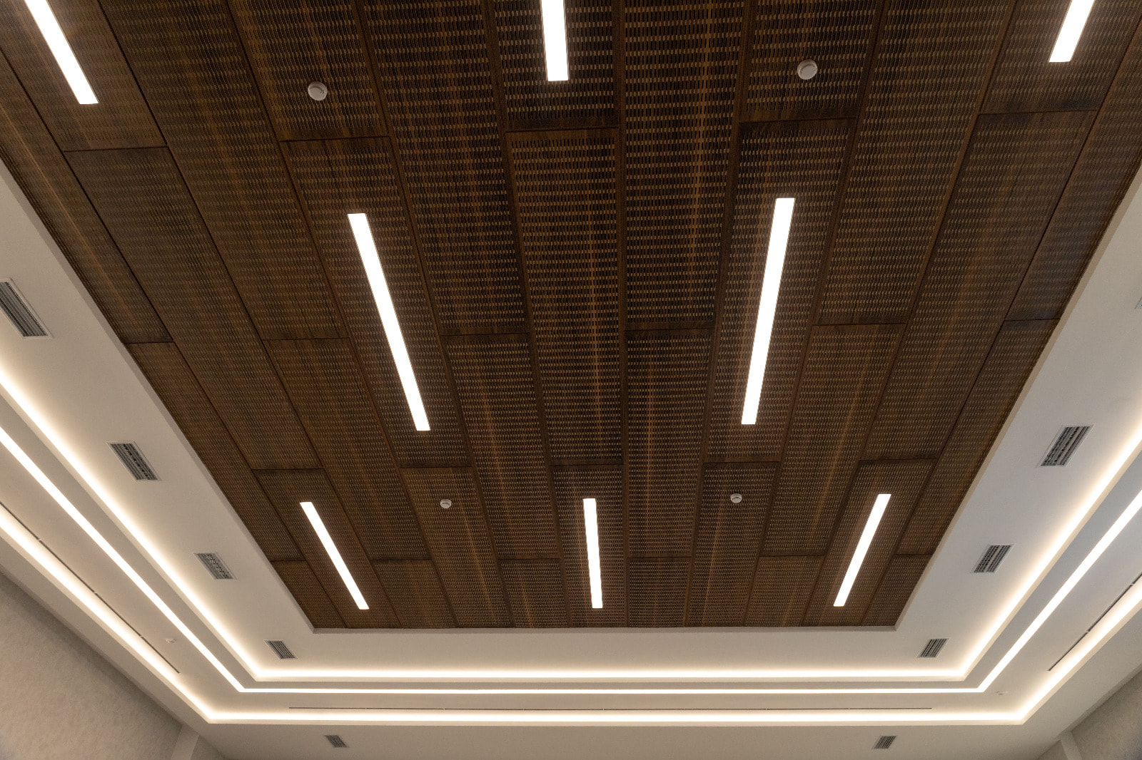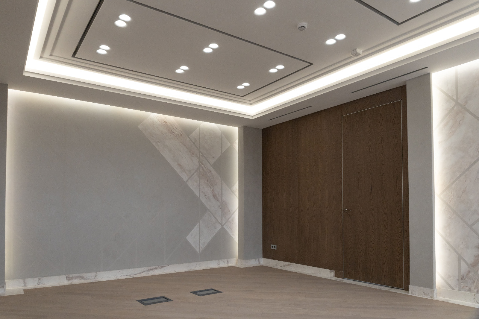 Для данного проекта под заказ были созданы светильники SP LINE на основе профиля разной формы и длины. Прямые линии отлично смотрятся между деревянных реек на потолке и в мраморных панелях, а крупная прямоугольная композиция подчеркивает геометрию комнаты.
