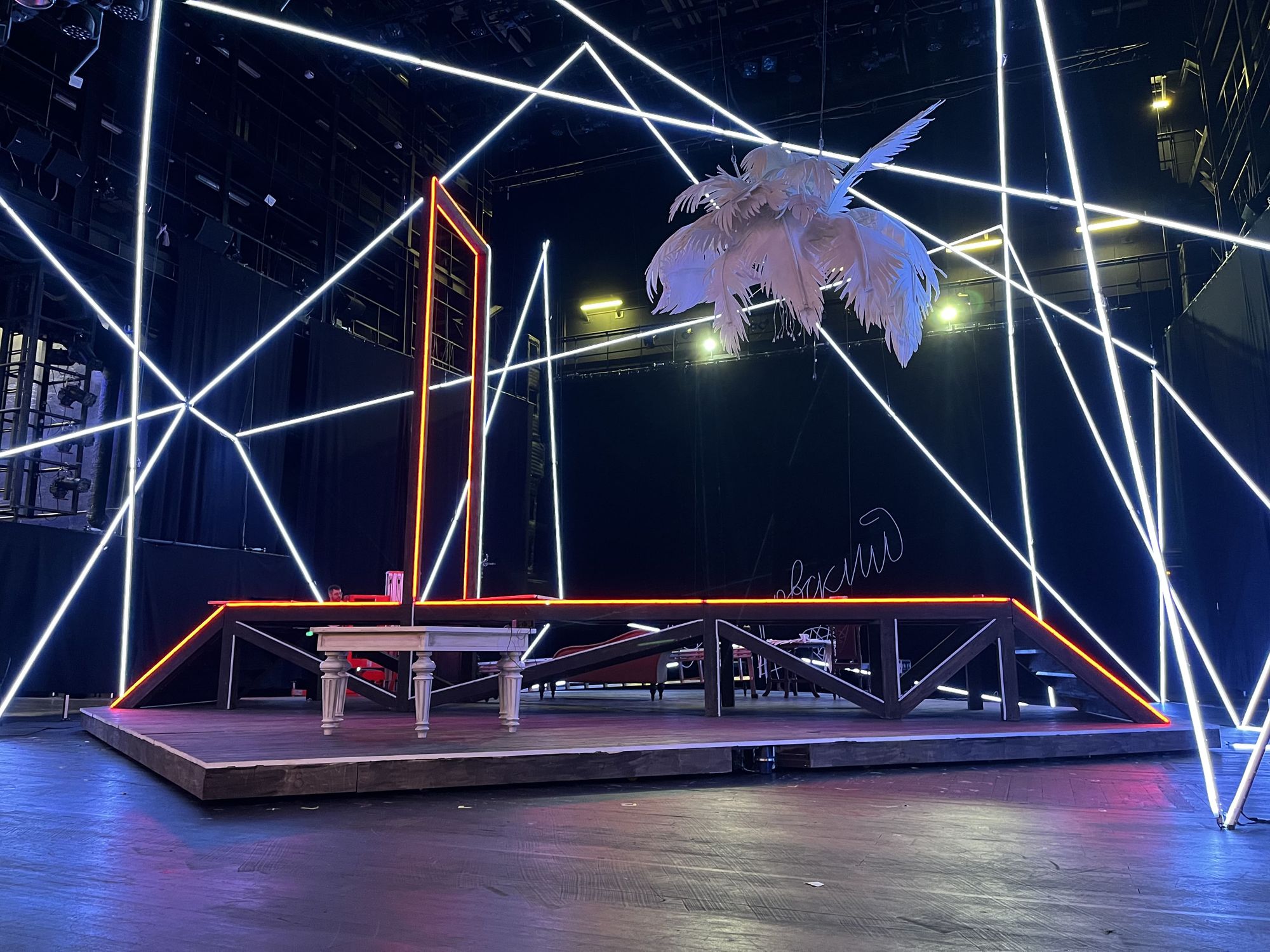 Композиция из ломаных линий света, напоминающая переплетения паутины, — это прекрасная альтернатива привычным театральным декорациям. Идея осуществилась благодаря круглому гибкому профилю WPH FLEX и RGB-ленте. Управление по протоколу SPI позволяет не только настраивать любые оттенки свечения ленты, но и создавать различные динамические эффекты, что немаловажно для оформления сценической площадки. Возведенный на ней помост также очерчен линией света по контуру, что выделяет конструкцию на темном фоне.