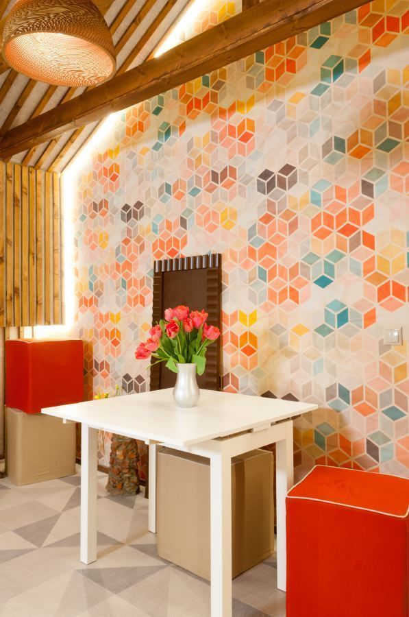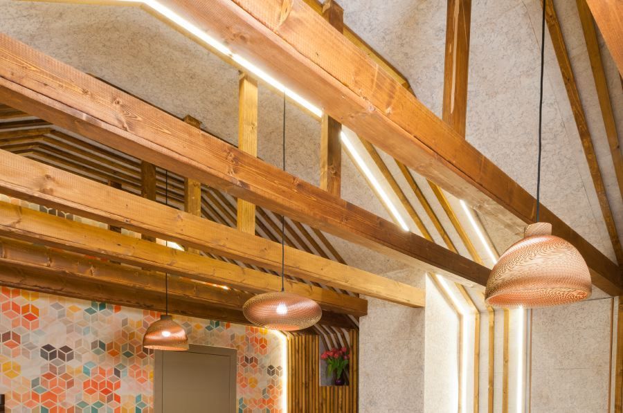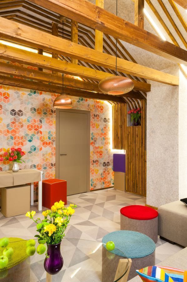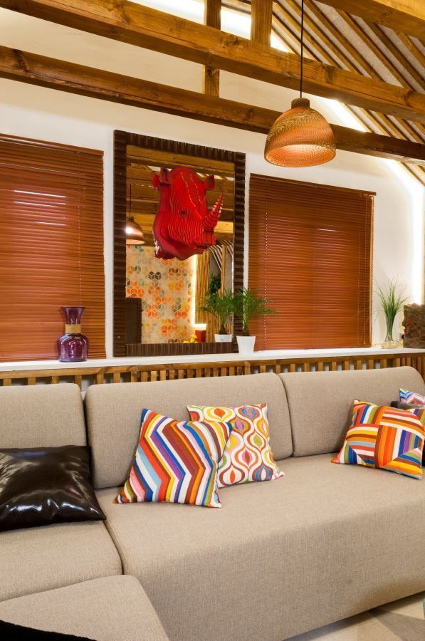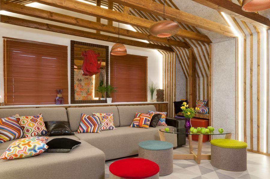 По замыслу дизайнеров стены были выполнены в африканском стиле, различные аксессуары добавили разнообразия красок, а светодиодная лента, проложенная в алюминиевом профиле MIC-2000 Anod между деревянных балок, наполнила все пространство гостиной приятным теплым светом. Высокий световой поток ленты сделал помещение ярким, радостным и уютным.
