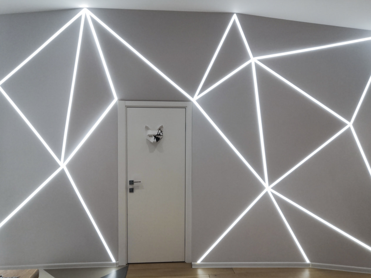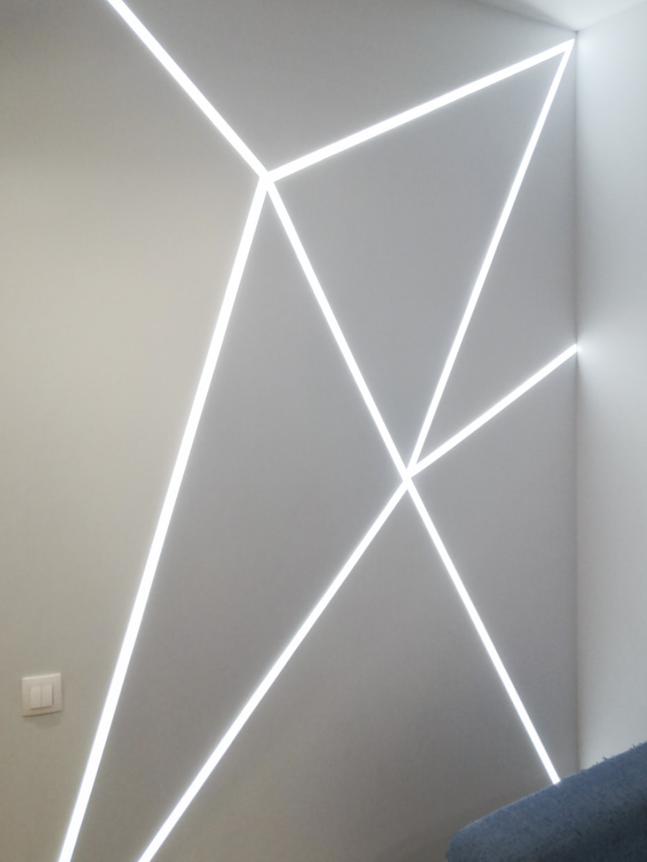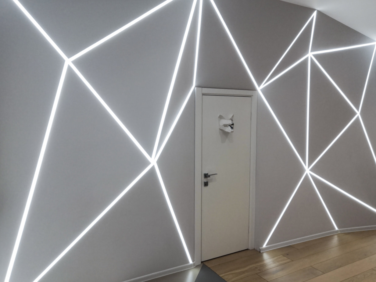 Удивительная игра света, создающая объемное изображение на абсолютно гладкой стене. Световые линии разной длины расположены на поверхности под определенным углом и создают на стене иллюзию объемной полусферы. Проект с необычной геометрией и строгой красотой реализован с минимальным количеством светотехнического оборудования — профилем и лентой.