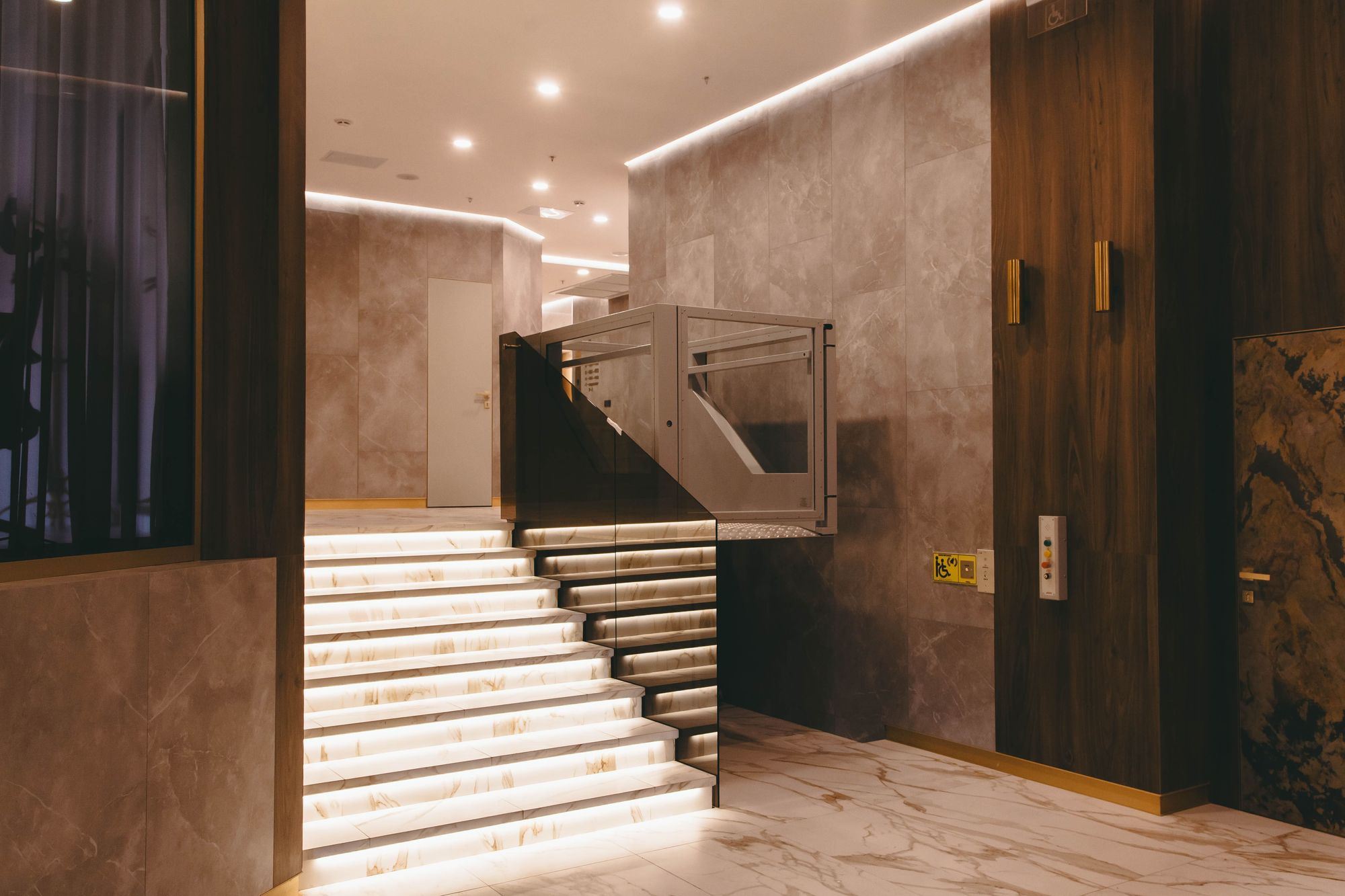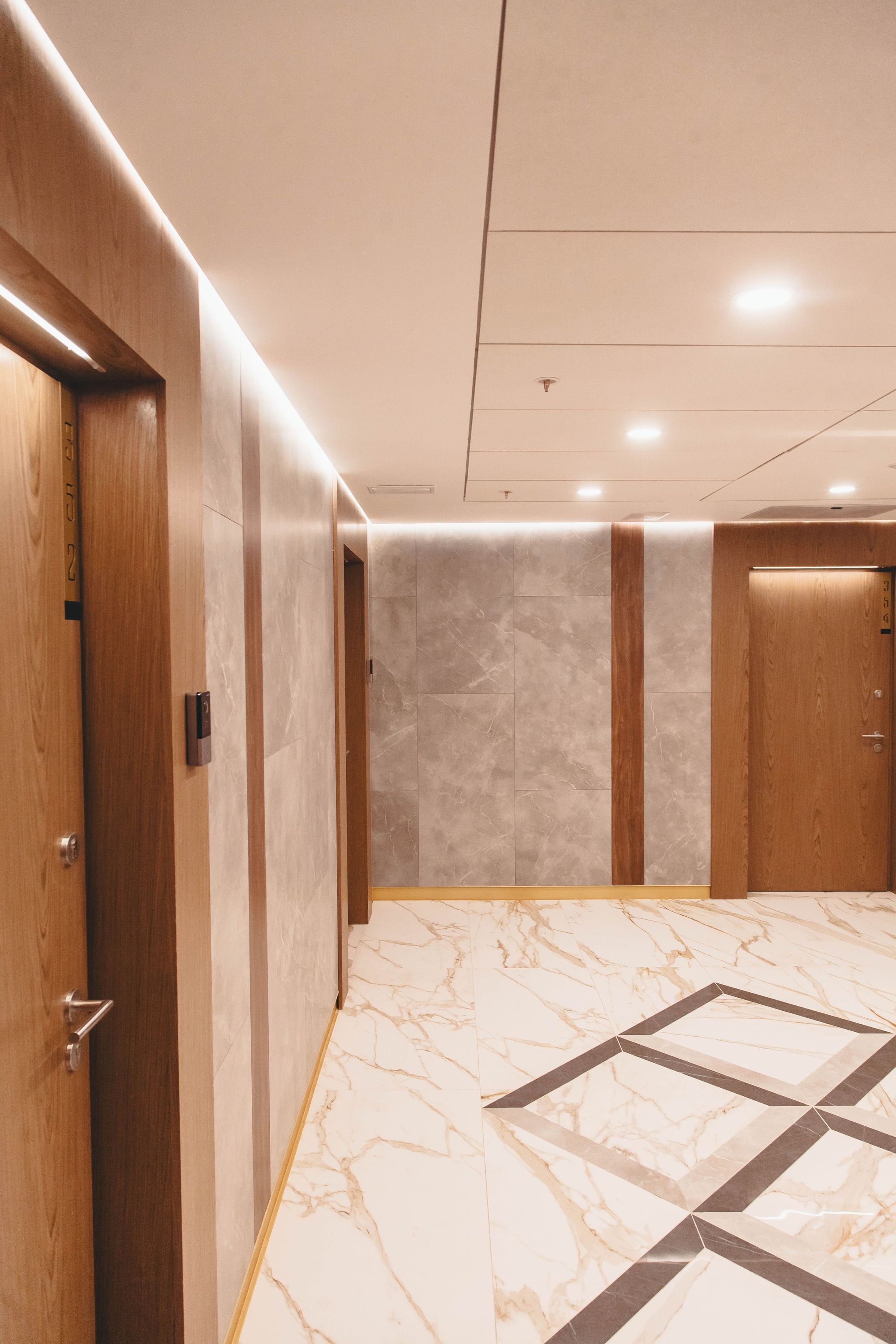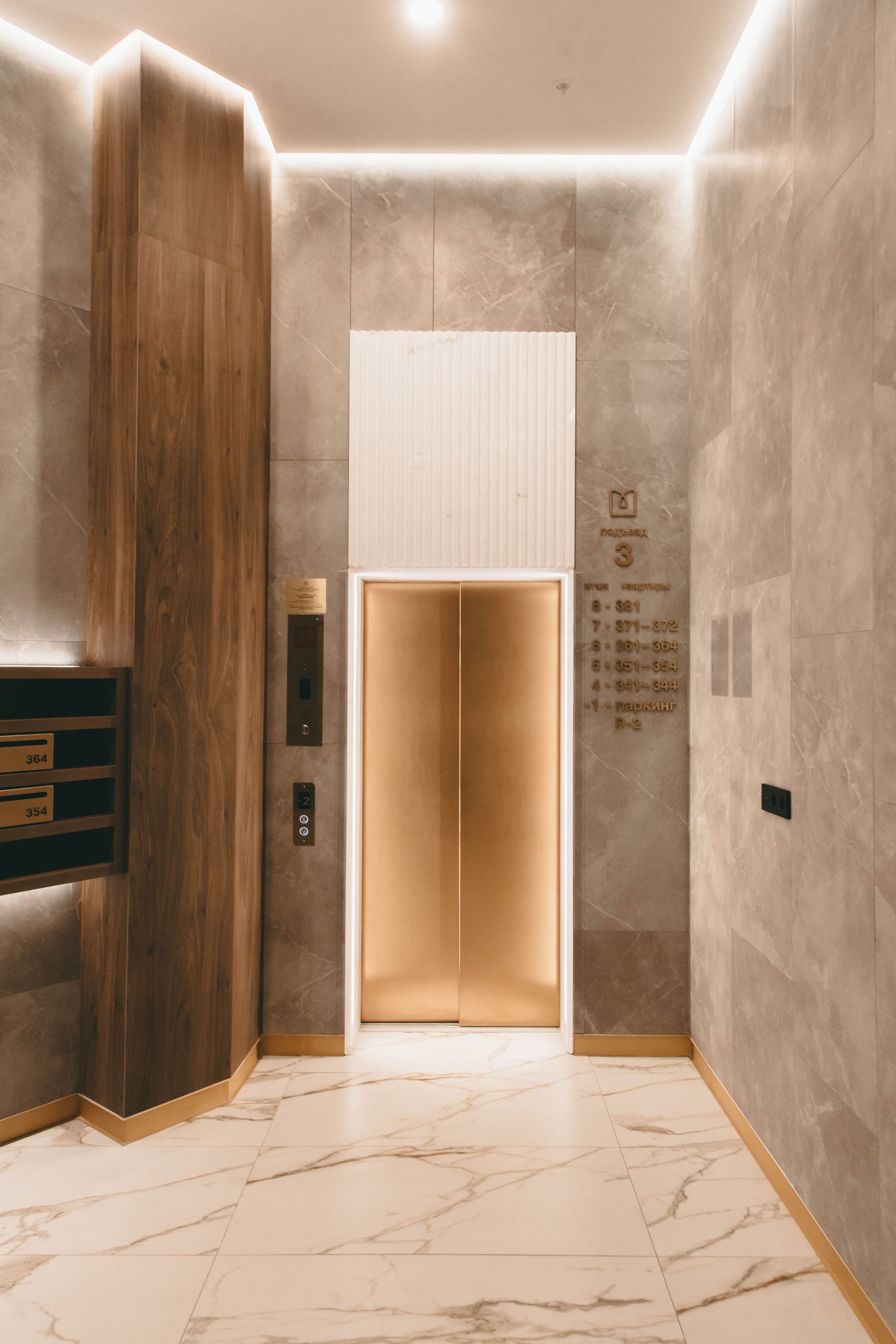 Еще больше света и легкости привносит индивидуальная подсветка над каждой дверью в квартиру. Встраиваемый профиль PDS в цвете шампань гармонично вписывается в деревянную отделку, а светодиодная лента COB с мощностью всего 4 Вт/м создает ненавязчивое свечение.